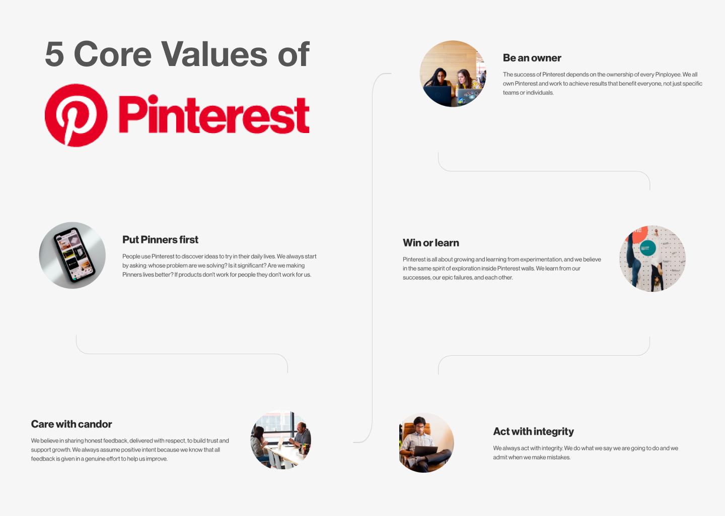 With over 440 million monthly users, Pinterest's goal is to build out the world's first visual discovery engine and “bring everyone the inspiration to create a life they love" (source). Users can browse and search the app for ideas, and save ("pin") those ideas for later use if needed. Pinterest divides the mission of their business and employees into 5 core values: