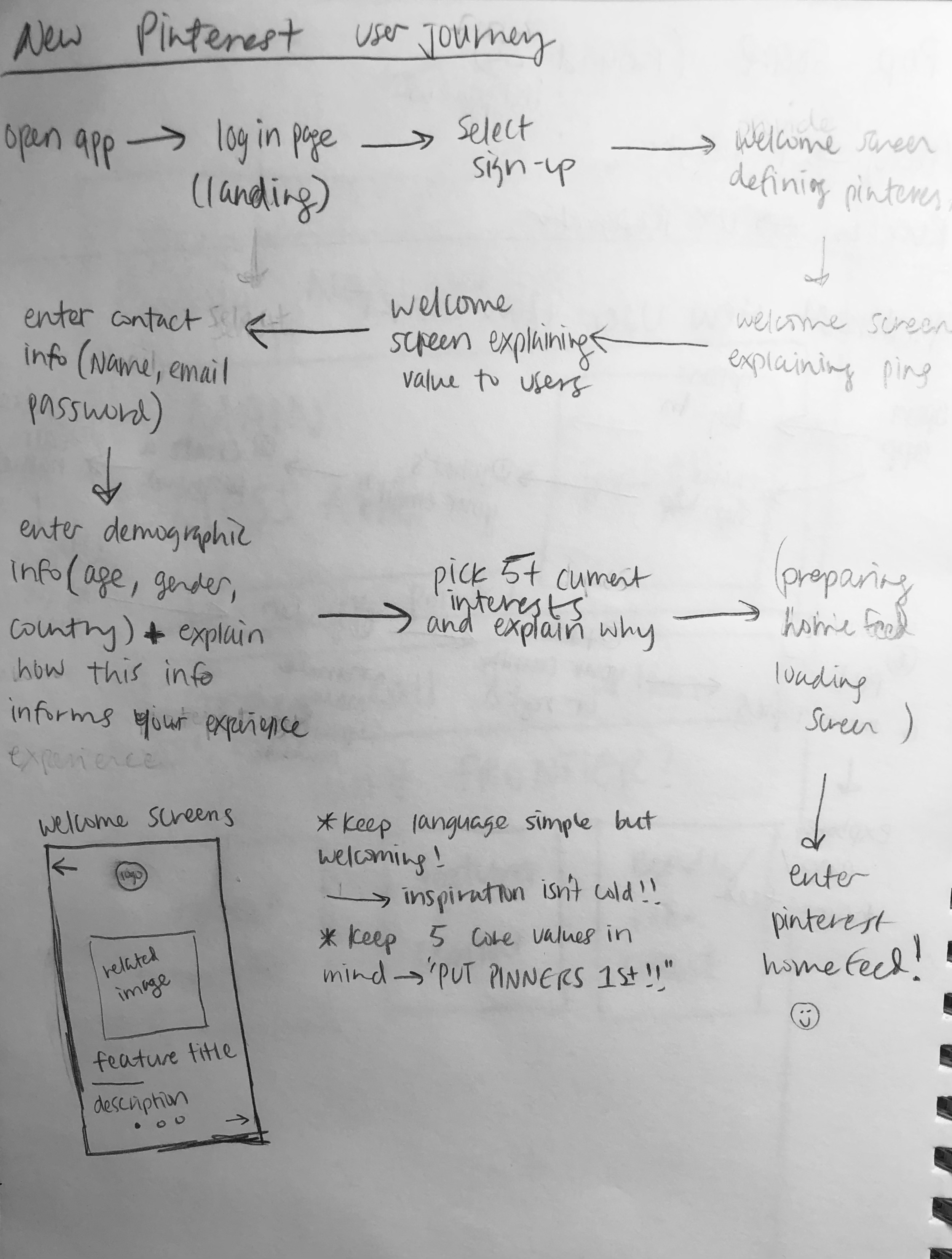 Learning more about Pinterest and their commitment to inspire users was incredibly helpful to me as I envisioned the value they might want to convey to users during an onboarding process. This part of the design challenge helped me realize that creating positive experiences for users starts with a brand's (and more specifically, a brand’s employee’s) commitment to make that happen.